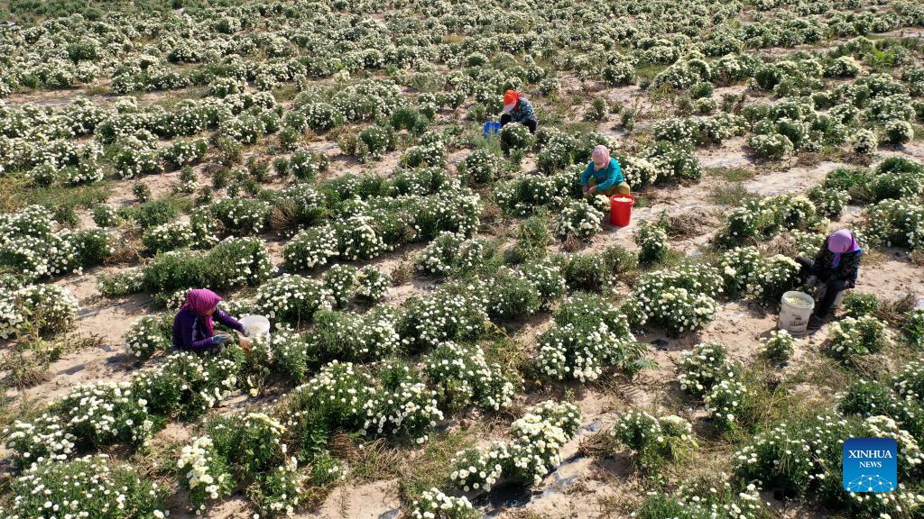 Aerial photo taken on Sept. 30, 2021 shows farmers picking chrysanthemums in Lingsha Township of Pingluo County, Shizuishan, northwest China's Ningxia Hui Autonomous Region. Farmers are busy in harvesting chrysanthemums recently in Lingsha Township. Local authorities have introduced traditional Chinese medicine manufacturers to promote the development of chrysanthemums industry with integration of planting, processing and sales. (Xinhua/Wang Peng)