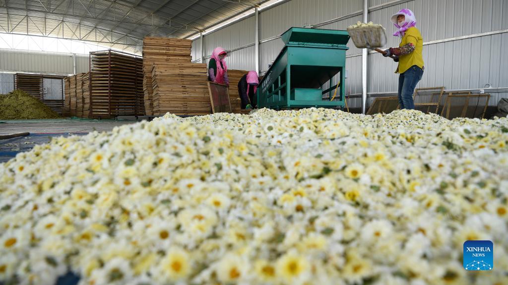 A farmer processes chrysanthemums in Lingsha Township of Pingluo County, Shizuishan, northwest China's Ningxia Hui Autonomous Region, Sept. 30, 2021. Farmers are busy in harvesting chrysanthemums recently in Lingsha Township. Local authorities have introduced traditional Chinese medicine manufacturers to promote the development of chrysanthemums industry with integration of planting, processing and sales. (Xinhua/Wang Peng)