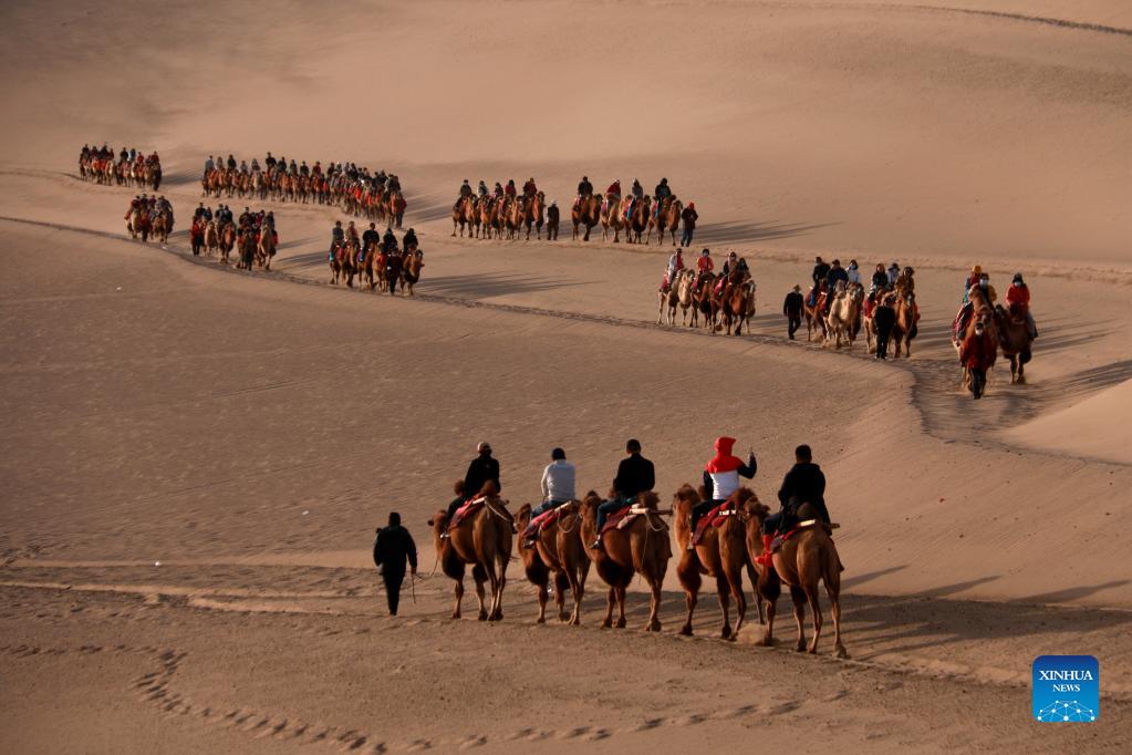 Tourists ride camels at the Mingsha Mountain and Crescent Spring scenic area during the ongoing National Day holiday in Dunhuang, northwest China's Gansu Province, Oct. 3, 2021. (Photo by Zhang Xiaoliang/Xinhua)
