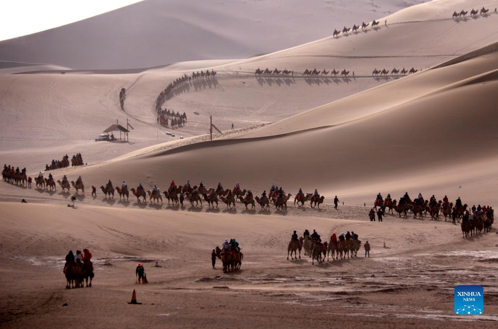 Tourists ride camels at the Mingsha Mountain and Crescent Spring scenic area during the ongoing National Day holiday in Dunhuang, northwest China's Gansu Province, Oct. 3, 2021. (Photo by Zhang Xiaoliang/Xinhua)