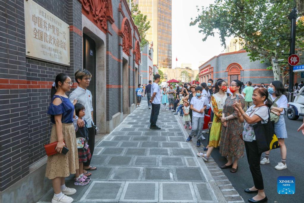Tourists take photos at the site of the first National Congress of the Communist Party of China (CPC) in east China's Shanghai, Oct. 3, 2021. East China's Shanghai is home to many landmark sites which bear witness to the CPC history and the CPC revolutionary activities. As "red tourism" becomes increasingly popular, the city has launched a special hop-on hop-off bus service that provides more fun to travel between five notable "red sites" during the National Day holiday. (Xinhua/Wang Xiang)