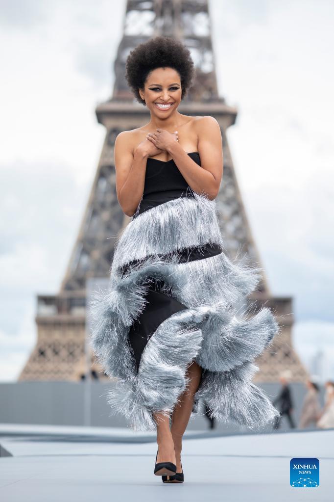 A model presents a creation for L'Oreal on the sidelines of the Paris Fashion Week Spring-Summer 2022 Ready-to-Wear collection shows at the Trocadero in Paris, France, on Oct. 3, 2021. (Xinhua)