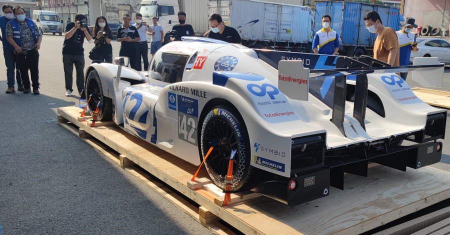A racing car by Michelin which is among the earliest exhibits in place for the 4th China International Import Expo (CIIE) arrives in Shanghai, east China, Sept. 27, 2021. (Xinhua)
