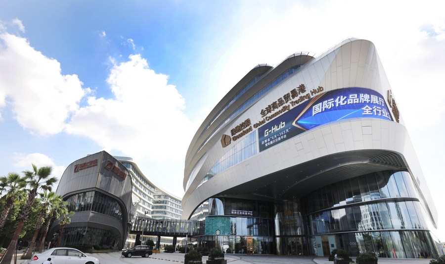 Photo taken on Oct. 5, 2021 shows the Global Commodity Trading Hub near the National Exhibition and Convention Center (Shanghai) in Shanghai, east China. (Xinhua/Fang Zhe)