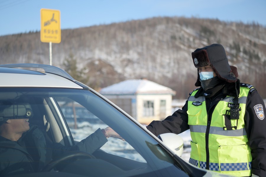 Traffic policeman Sun Chen checks a driver's license on a road in Huzhong District of Dahinggan, northeast China's Heilongjiang Province, Jan. 8, 2021. (Xinhua/Wang Jianwei)