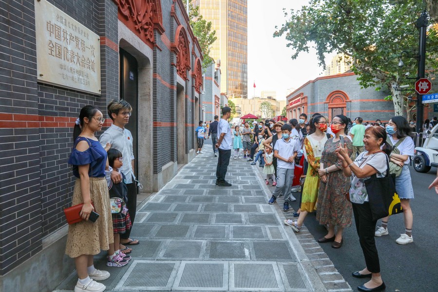 Tourists take photos at the site of the first National Congress of the Communist Party of China (CPC) in east China's Shanghai, Oct. 3, 2021. (Xinhua/Wang Xiang)