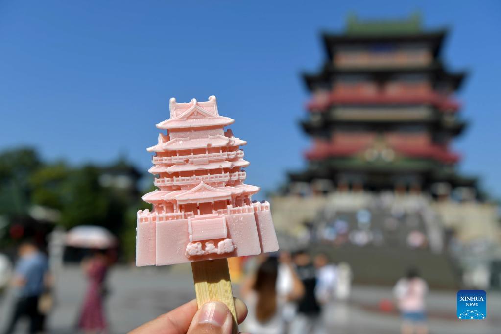 Photo taken on Oct. 5, 2021 shows an ice cream in the shape of the Tengwang Pavilion at the Tengwang Pavilion scenic spot in Nanchang, capital of east China's Jiangxi Province. (Xinhua/Peng Zhaozhi)