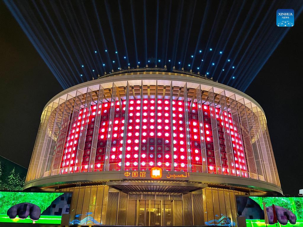 Photo taken on Oct. 4, 2021 shows the light show at the China Pavilion of Expo 2020 Dubai in Dubai, the United Arab Emirates. Covering an area of 4,636 square meters, the China Pavilion is one of the largest at the expo. Featuring a lantern-shaped design, the pavilion is called "The Light of China," symbolizing hope and a bright future. (Xinhua/Su Xiaopo)