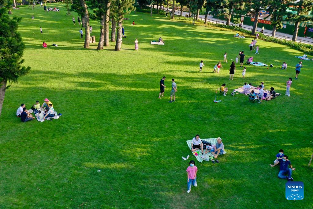 Aerial photo taken on Oct. 5, 2021 shows people having fun at the Xiamen Botanical Garden in Xiamen, southeast China's Fujian Province. Outdoor public places in Xiamen started to reopen from Oct. 5, as the results of the sixth round of citywide nucleic acid testing all came out negative. (Xinhua/Jiang Kehong)