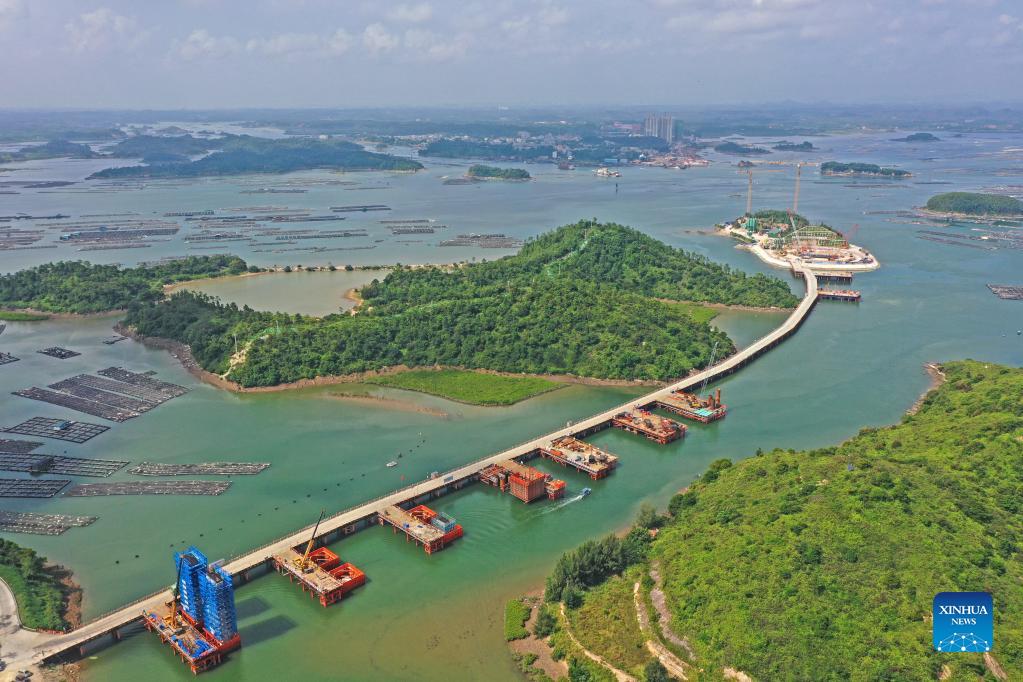 Aerial photo taken on Oct. 4, 2021 shows the construction site of the Longmen Bridge in Qinzhou City, south China's Guangxi Zhuang Autonomous Region. Located in the city of Qinzhou, the Longmen Bridge, a cross-sea bridge connecting coastal cities along the Beibu Gulf of Guangxi, will stretch roughly 7.6 km, with the main bridge measuring 1,198 meters in length. (Xinhua/Zhou Hua)