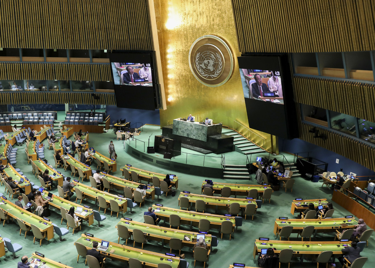 Zhang Jun, China's permanent representative to the United Nations, reads a joint statement by 75 countries at the General Debate of the Third Committee of the UN General Assembly on Friday, Oct 1, 2021, calling for global solidarity for vaccine equity. [Photo/Xinhua]