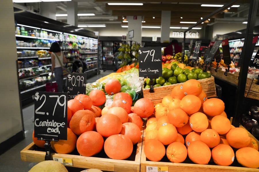 A customer selects goods at a supermarket in New York, the United States, Aug. 11, 2021. (Xinhua/Wang Ying)