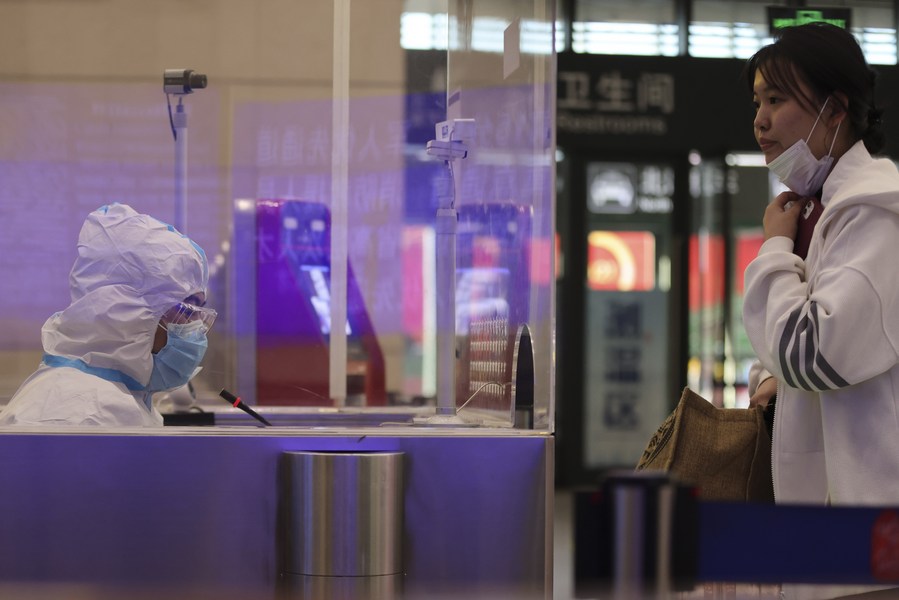 A staff member checks the personal information of a traveler at Harbin Railway Station in Harbin, northeast China's Heilongjiang Province, Oct. 2, 2021.(Xinhua/Zhang Tao)