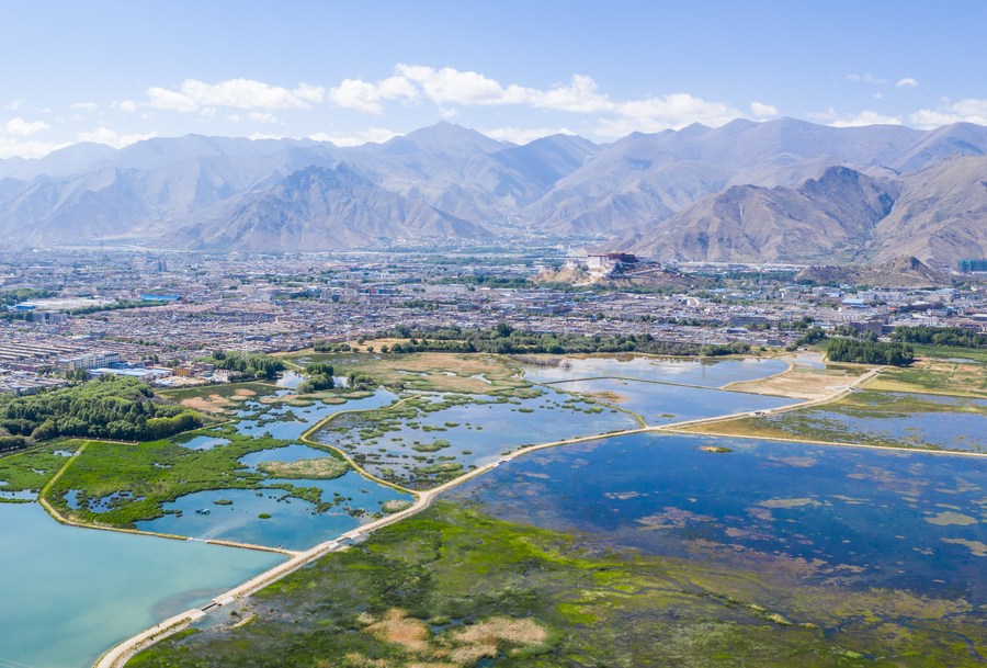Aerial photo taken on June 5, 2019 shows a view of Lhalu Wetland National Nature Reserve in Lhasa, southwest China's Tibet Autonomous Region. (Xinhua/Purbu Zhaxi)