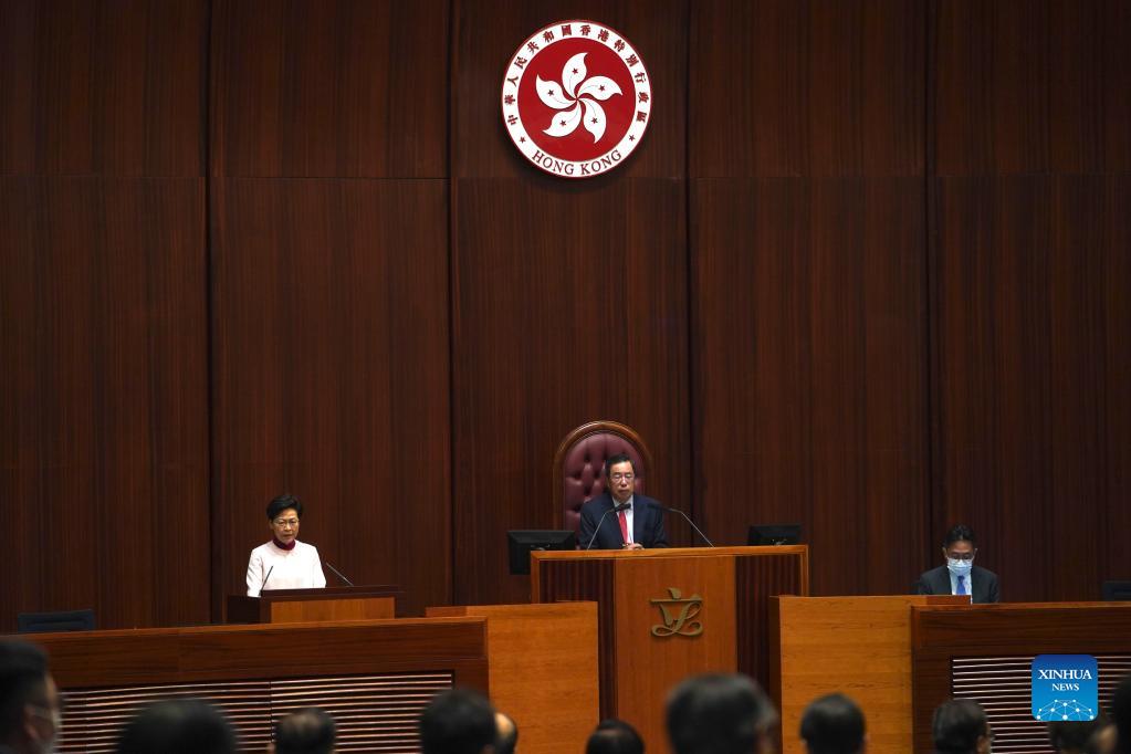 Chief Executive of China's Hong Kong Special Administrative Region (HKSAR) Carrie Lam (L) delivers the 2021 policy address at a Legislative Council meeting in Hong Kong, south China, Oct. 6, 2021. Carrie Lam on Wednesday morning delivered the 2021 policy address, outlining concrete plans to address deep-seated problems such as the housing shortage and to better integrate into the national development. (Xinhua/Lui Siu Wai)