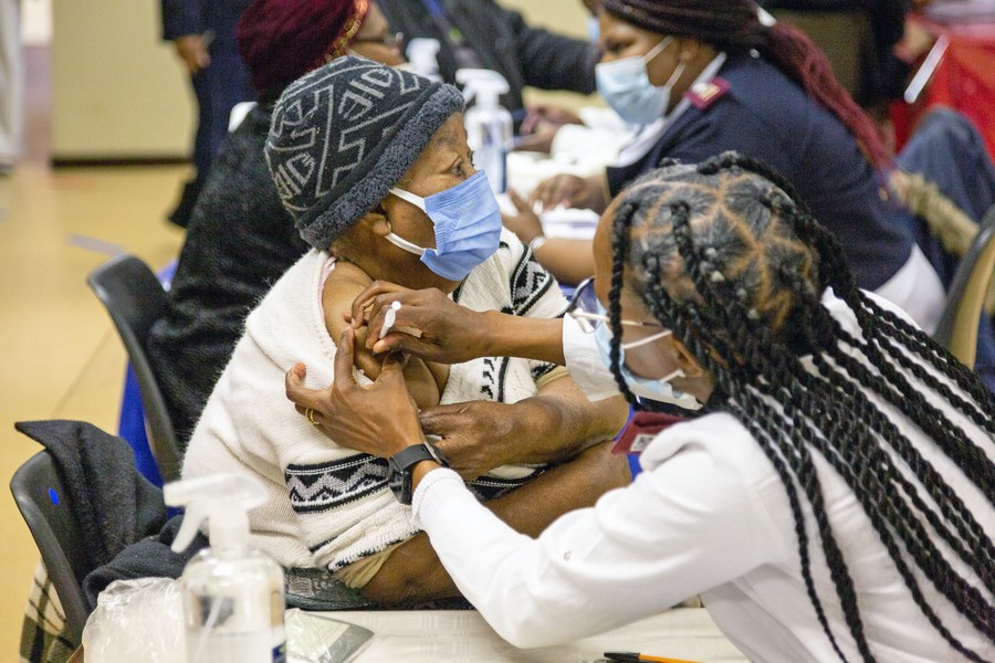 An elderly person receives a dose of COVID-19 vaccine at a vaccination site in Johannesburg, South Africa, May 17, 2021. (Photo by Yeshiel/Xinhua)