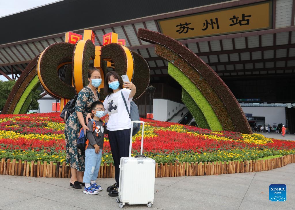 Passengers take selfies before their return trip at the Suzhou railway station in Suzhou, east China's Jiangsu Province, Oct. 7, 2021. Transportation hubs across China are witnessing the peak of return passengers as the week-long holiday draws to an end on Thursday. (Photo by Hang Xingwei/Xinhua)