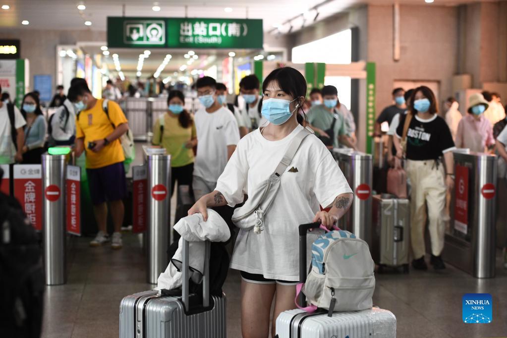 Passengers exit the Nanjing railway station in Nanjing, east China's Jiangsu Province, Oct. 7, 2021. Transportation hubs across China are witnessing the peak of return passengers as the week-long holiday draws to an end on Thursday. (Photo by Yang Suping/Xinhua)