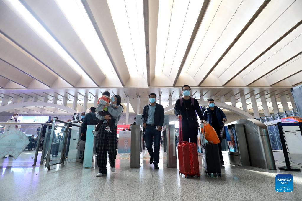 Passengers check in at the Shijiazhuang railway station in Shijiazhuang, north China's Hebei Province, Oct. 7, 2021. Transportation hubs across China are witnessing the peak of return passengers as the week-long holiday draws to an end on Thursday. (Photo by Liang Zidong/Xinhua)