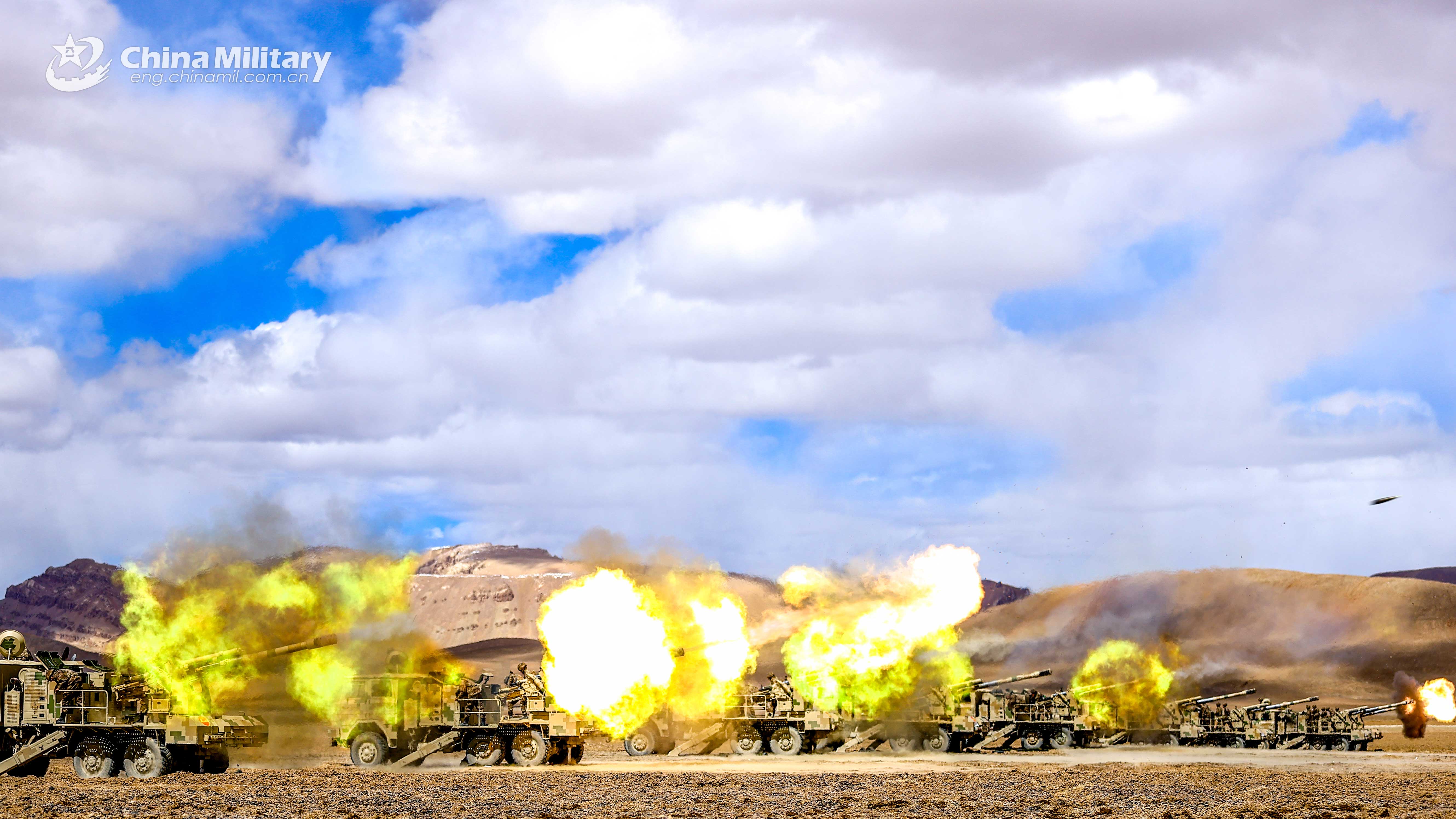 Truck-mounted self-propelled howitzers assigned to a combined-arms regiment under the PLA Xinjiang Military Command fire at targets during a live-fire training exercise in mid September, 2021. (eng.chinamil.com.cn/Photo by Zhou Kaiwei)