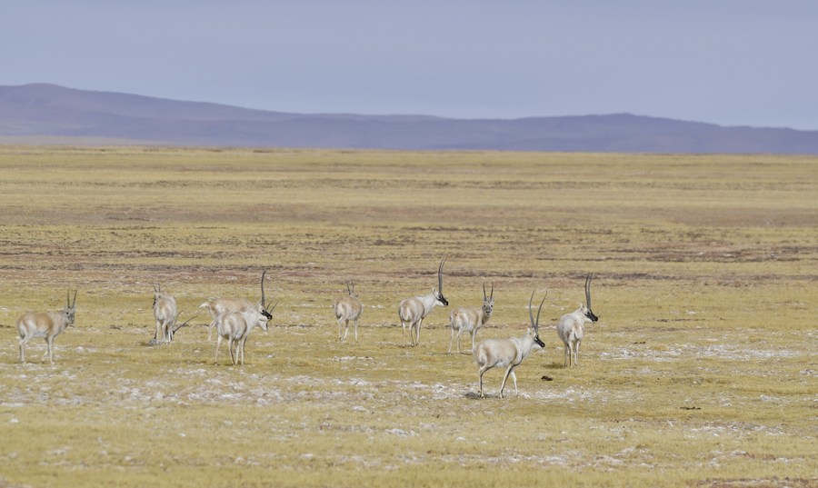 Photo taken on Jan. 15, 2021 shows Tibetan antelopes in southwest China's Tibet Autonomous Region. (Xinhua/Zhang Rufeng)