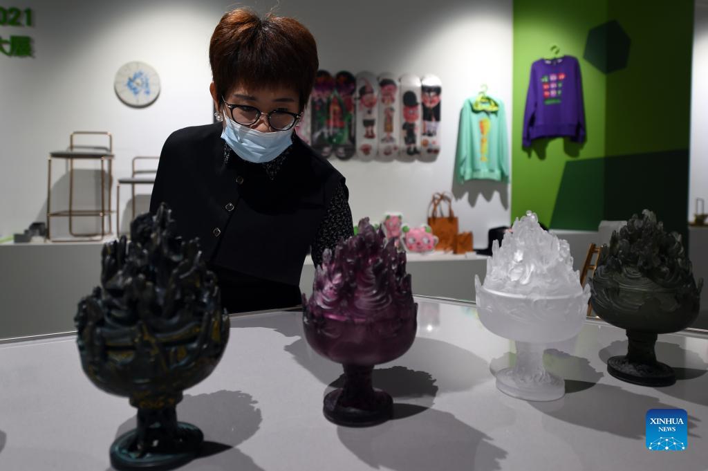 A woman watches cultural and creative products displayed at the Shijiazhuang Library in Shijiazhuang, capital of north China's Hebei Province, Oct. 6, 2021. The library hosted a series of cultural events to better entertain visitors during the week-long National Day holiday starting from Oct. 1. (Xinhua/Luo Xuefeng)