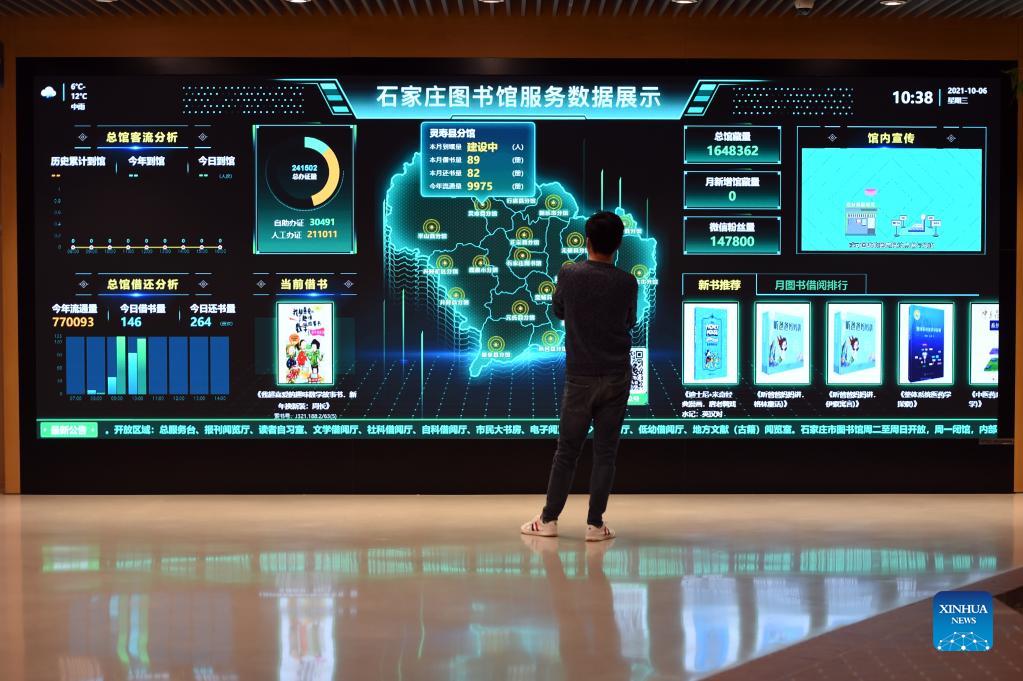 A man watches service data displayed on a giant screen at the Shijiazhuang Library in Shijiazhuang, capital of north China's Hebei Province, Oct. 6, 2021. The library hosted a series of cultural events to better entertain visitors during the week-long National Day holiday starting from Oct. 1. (Xinhua/Luo Xuefeng)