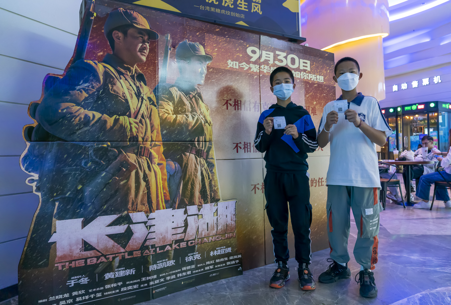 Two boys pose for a photo in front of a poster board for "The Battle at Lake Changjin" at a theater in Kunming, southwest China's Yunnan Province, Oct. 1, 2021. (Xinhua/Chen Xinbo)