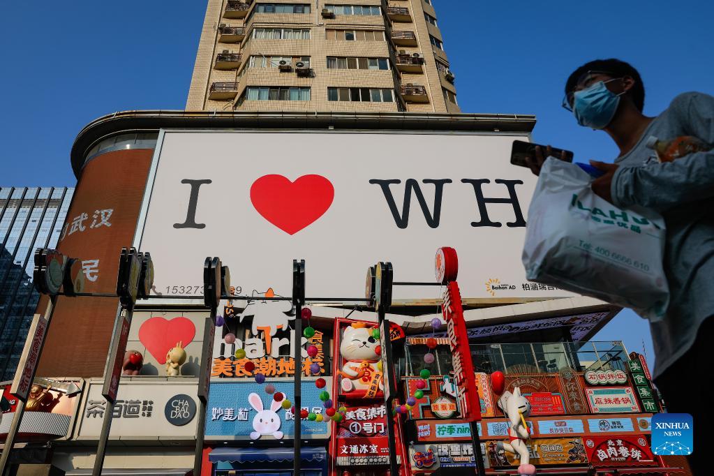 A man visits a pedestrian street during the week-long National Day holiday in Wuhan, central China's Hubei Province, Oct. 3, 2021. (Xinhua/Xiao Yijiu)