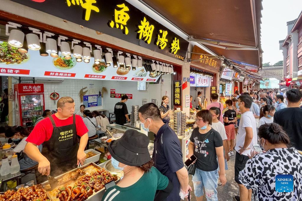 People visit a food street during the week-long National Day holiday in Wuhan, central China's Hubei Province, Oct. 2, 2021. (Xinhua/Xiao Yijiu)