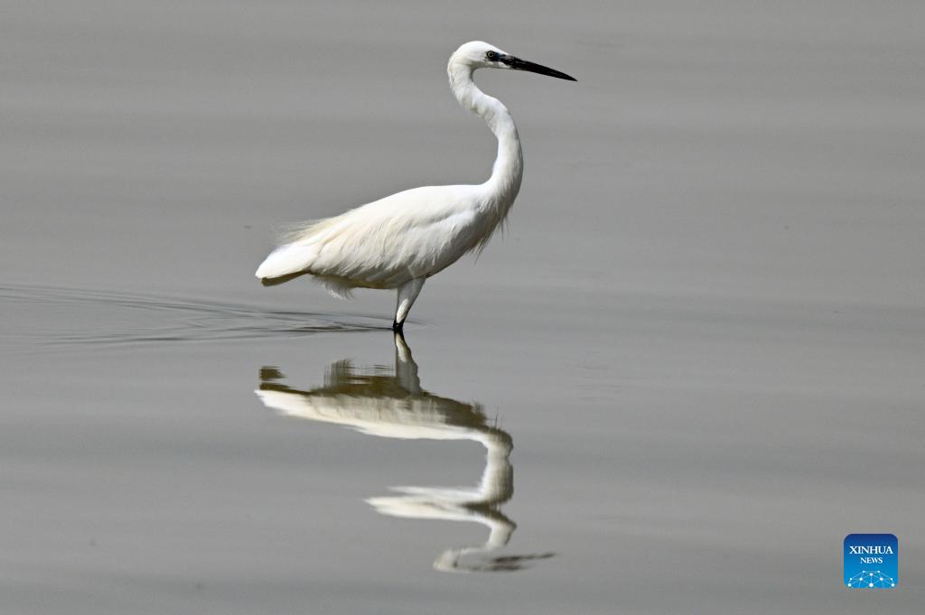 An egret forages at a beach in Capital Governorate, Kuwait, Oct. 6, 2021. (Photo by Ghazy Qaffaf/Xinhua)