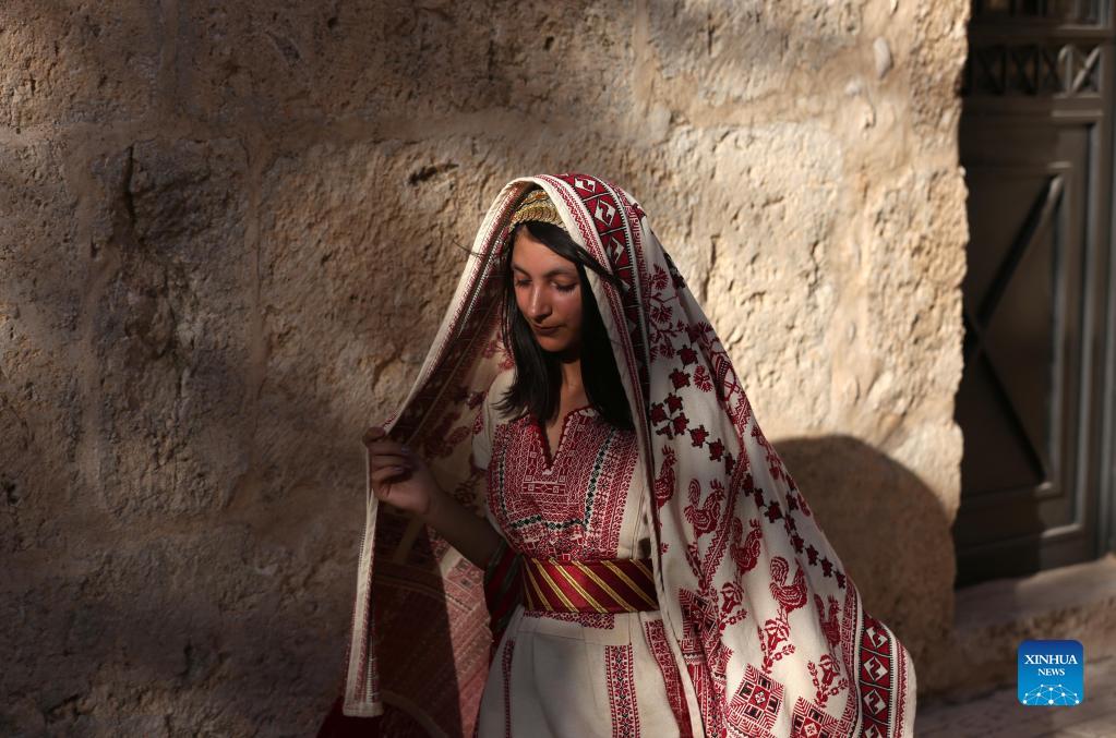 A Palestinian model presents a traditional Palestinian dress during a fashion show in celebration of Palestinian Heritage Day at Sebastia Village, north of the West Bank city of Nablus, on Oct. 7, 2021. (Photo by Ayman Nobani/Xinhua)