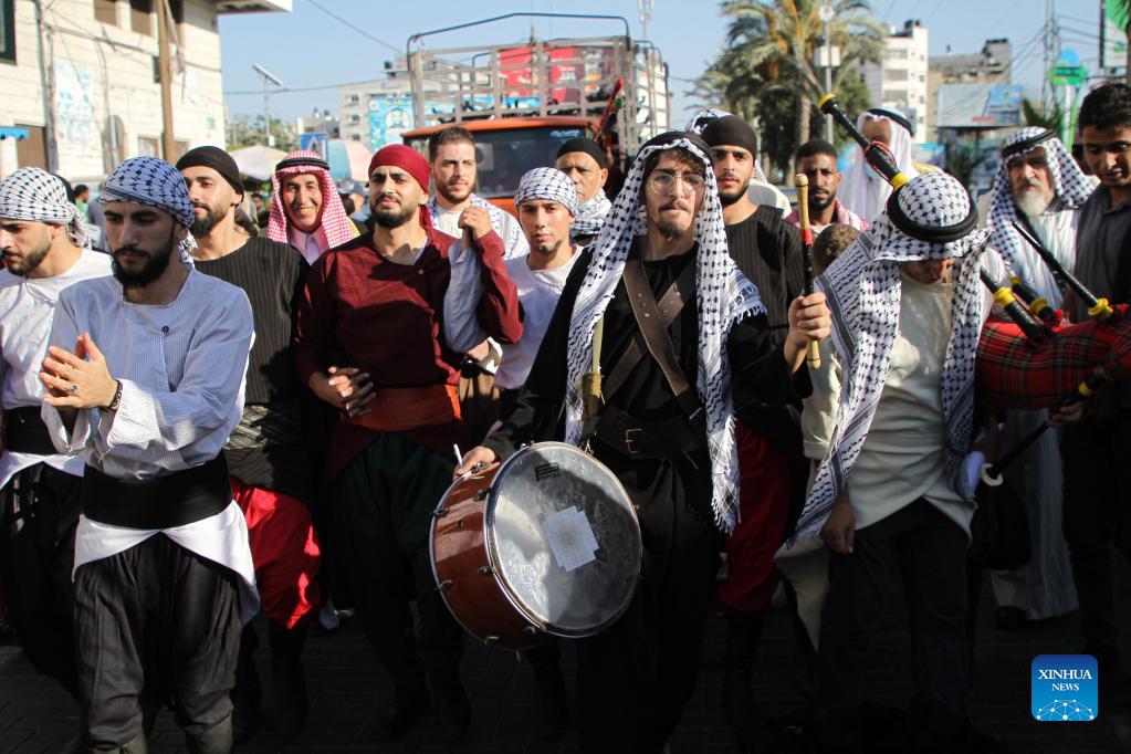 Palestinians participate in an event simulating a traditional Palestinian wedding in celebration of Palestinian Heritage Day in Gaza City, on Oct. 7, 2021. (Photo by Rizek Abdeljawad/Xinhua)