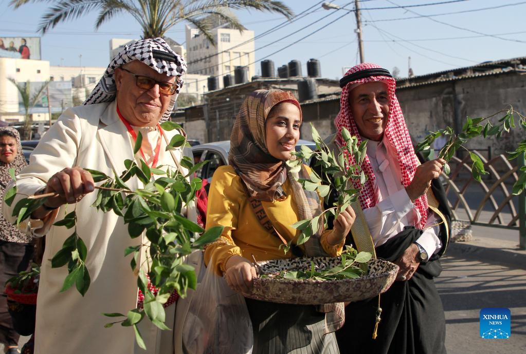 Palestinians participate in an event simulating a traditional Palestinian wedding in celebration of Palestinian Heritage Day in Gaza City, on Oct. 7, 2021. (Photo by Rizek Abdeljawad/Xinhua)