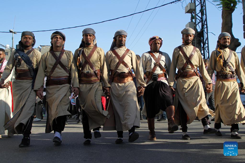 Palestinians perform traditional "Dabka" dance during an event in celebration of Palestinian Heritage Day in Gaza City, on Oct. 7, 2021. (Photo by Rizek Abdeljawad/Xinhua)