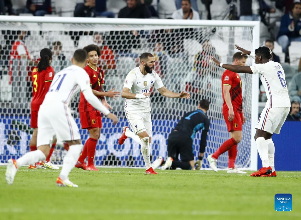 France's Karim Benzema (C) celebrates his goal during the UEFA Nations League semifinal between Belgium and France in Turin, Italy, Oct. 7, 2021. (Str/Xinhua)