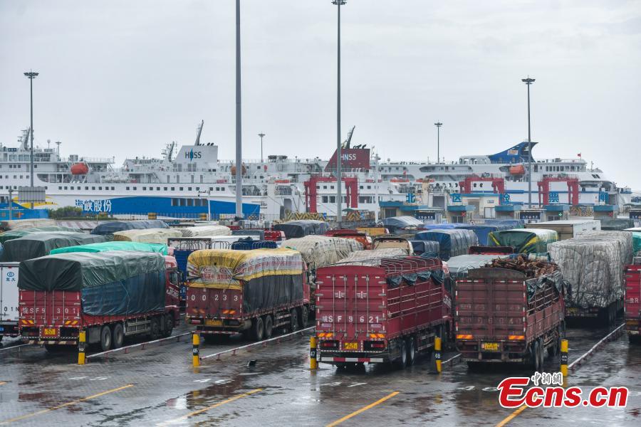 Trucks wait in line for restoration of the port in Haikou City, south China's Hainan Province, Oct. 7, 2021. (Photo: China News Service/Luo Yunfei)