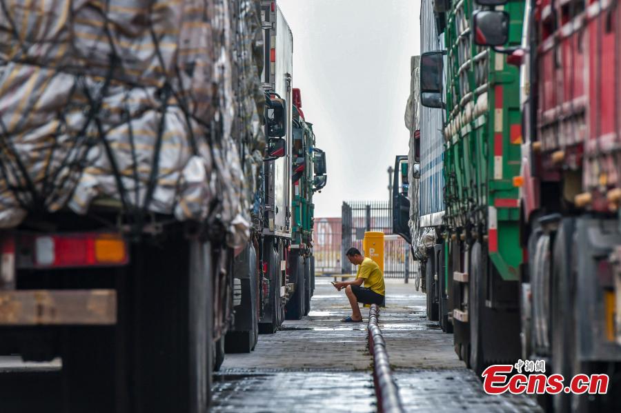 A truck driver plays on his mobile phone at a port in Haikou City, south China's Hainan Province, Oct. 7, 2021. (Photo: China News Service/Luo Yunfei)