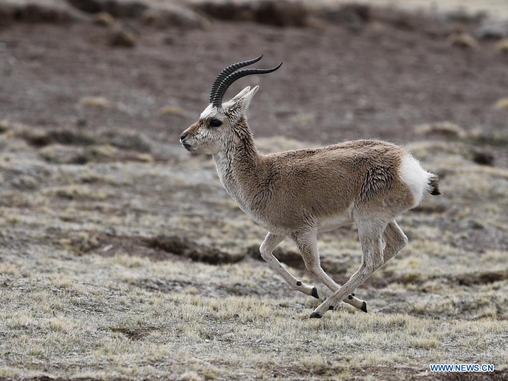 A Tibetan antelope is seen at the source of the Yellow River section of the Sanjiangyuan National Park in Golog Tibetan Autonomous Prefecture of northwest China's Qinghai Province, May 25, 2021. (Xinhua/Zhang Long)
