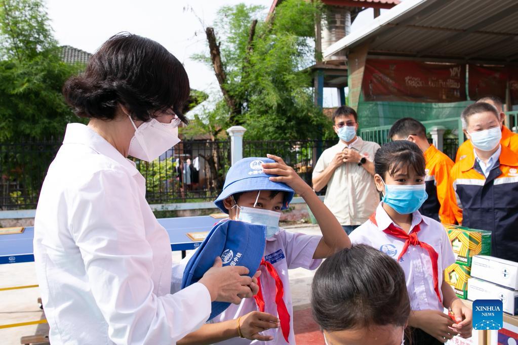 A representative with the China-Laos railway engineering companies, including the China Railway International Group (CRIG) and the China Railway No.2 Engineering Group (CREC-2), hands over gifts to the pupils of the China-Laos Friendship Nongping Primary School in Vientiane, Laos, Oct. 8, 2021. The China-Laos Friendship Nongping Primary School in Lao capital Vientiane received a donation of newly-constructed sepak takraw court, ping-pong tables and anti-epidemic supplies from China-Laos railway engineering companies on Friday. (Photo by Kaikeo Saiyasane/Xinhua)