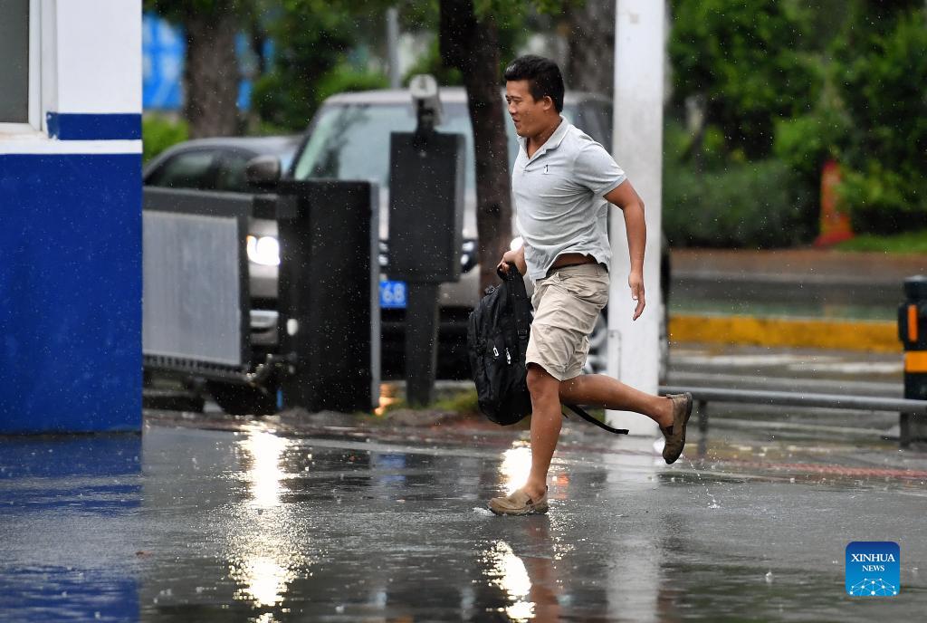 A pedestrian runs to take shelter from rain in Haikou, capital of south China's Hainan Province, Oct. 8, 2021. Lionrock, the 17th typhoon to affect China this year, is heading toward the island province of Hainan, according to local meteorological authorities. The typhoon, escalated from a tropical depression early Friday morning in the South China Sea, was observed on waters 150 km southeast of Wanning City in Hainan at 8 a.m., said the provincial meteorological department. It has issued a level III alert for the approaching typhoon. (Xinhua/Guo Cheng)