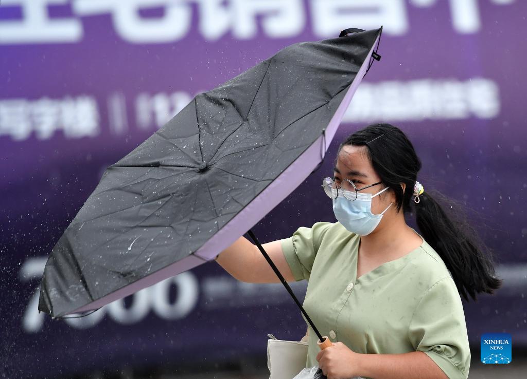 A pedestrian's umbrella is blown inside out by strong wind in Haikou, capital of south China's Hainan Province, Oct. 8, 2021. Lionrock, the 17th typhoon to affect China this year, is heading toward the island province of Hainan, according to local meteorological authorities. The typhoon, escalated from a tropical depression early Friday morning in the South China Sea, was observed on waters 150 km southeast of Wanning City in Hainan at 8 a.m., said the provincial meteorological department. It has issued a level III alert for the approaching typhoon. (Xinhua/Guo Cheng)