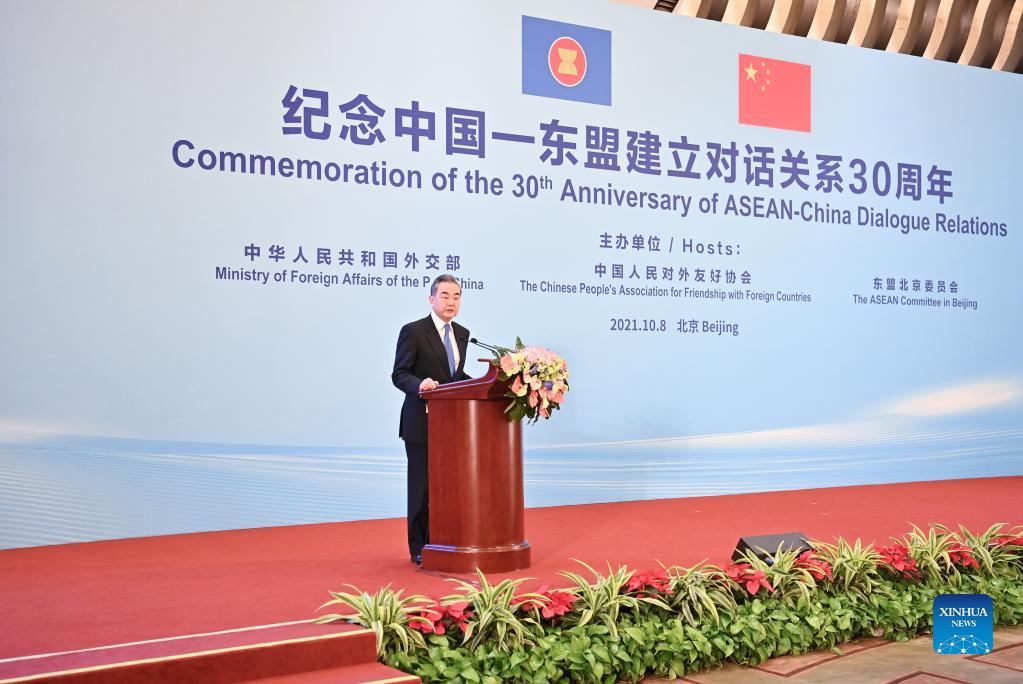 Chinese State Councilor and Foreign Minister Wang Yi speaks at a reception to commemorate the 30th anniversary of the establishment of dialogue relations between China and ASEAN in Beijing, capital of China, Oct. 8, 2021. (Xinhua/Li Xiang)
