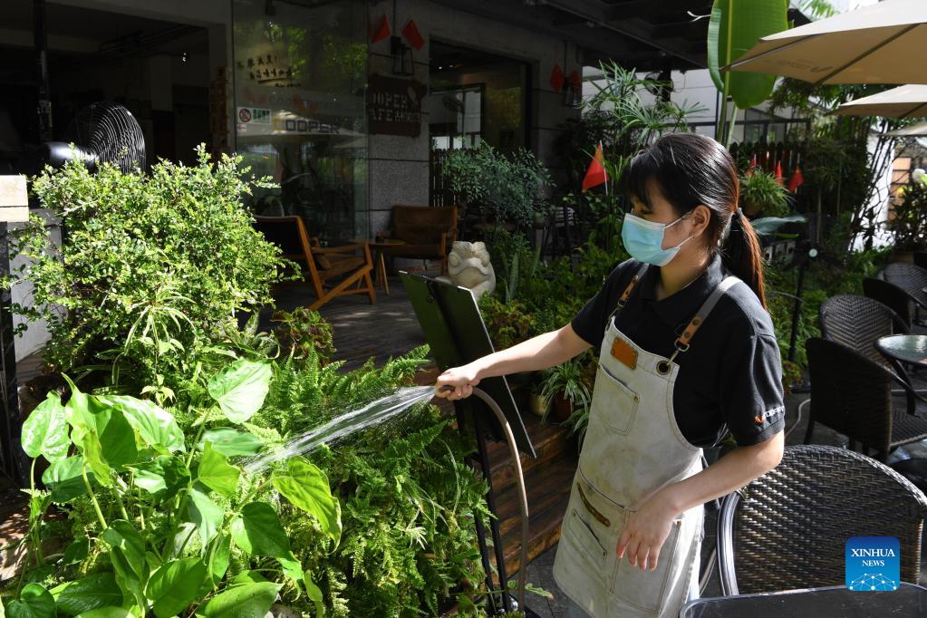A staff member waters plants in front of a coffee shop in Siming District of Xiamen City, southeast China's Fujian Province, Oct. 8, 2021. The city of Xiamen in southeast China's Fujian Province, which witnessed the country's latest resurgence of COVID-19 cluster infections, cleared all medium- and high-risk areas for COVID-19 on Thursday night. The city downgraded three medium-risk areas and one high-risk area for COVID-19 to low-risk areas starting 9 p.m. Thursday, according to the municipal epidemic prevention and control headquarters. (Xinhua/Jiang Kehong)