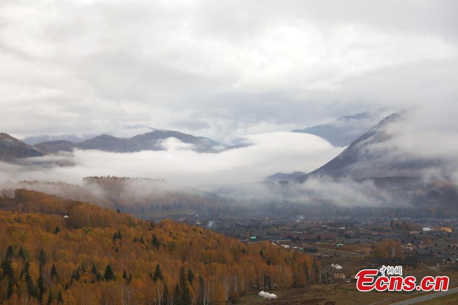Photo taken on Oct. 7, 2021 shows white birches and pine trees decorate Burqin County in Xinjiang Autonomous region, like a natural oil painting on the land. The county has welcomed the most beautiful season of the year.(Photo:China News Service/Liu Shihe)