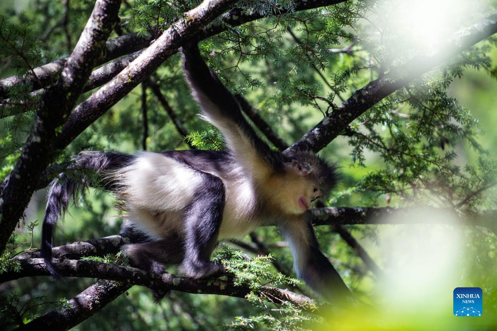 A snub-nosed monkey is pictured at the Yunnan Snub-nosed Monkey National Park in Shangri-La, Deqen Tibetan Autonomous Prefecture, southwest China's Yunnan Province, July 19, 2021. The black-and-white snub-nosed monkey, also known as the Yunnan golden hair monkey, is a national first-class protected animal of China. The species is also on the Red List of the International Union for Conservation of Nature and Natural Resources (IUCN). Around the 1980s, hunting and logging had damaged the monkeys' habitats, posing threats to their survival. In 1983, Yunnan Province established the Baima Snow Mountain National Nature Reserve to save the endangered monkeys. To make the monkeys feel "at home," residents nearby were also mobilized to participate in the conservation. Thanks to the joint efforts of the government, researchers and local villagers, the number of Yunnan golden hair monkeys has risen from no more than 1,500 to over 3,300. (Xinhua/Jiang Wenyao)