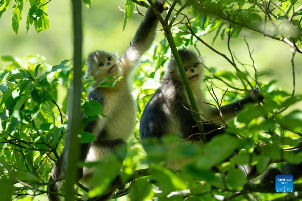 Snub-nosed monkeys are pictured at the Yunnan Snub-nosed Monkey National Park in Shangri-La, Deqen Tibetan Autonomous Prefecture, southwest China's Yunnan Province, July 19, 2021. The black-and-white snub-nosed monkey, also known as the Yunnan golden hair monkey, is a national first-class protected animal of China. The species is also on the Red List of the International Union for Conservation of Nature and Natural Resources (IUCN). Around the 1980s, hunting and logging had damaged the monkeys' habitats, posing threats to their survival. In 1983, Yunnan Province established the Baima Snow Mountain National Nature Reserve to save the endangered monkeys. To make the monkeys feel "at home," residents nearby were also mobilized to participate in the conservation. Thanks to the joint efforts of the government, researchers and local villagers, the number of Yunnan golden hair monkeys has risen from no more than 1,500 to over 3,300. (Xinhua/Jiang Wenyao)