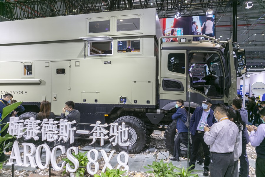 A Mercedes-Benz Arocs 8X8 vehicle is seen at the Automobile exhibition area during the third China International Import Expo (CIIE) in Shanghai, east China, Nov. 5, 2020. (Xinhua/Wang Xiang)
