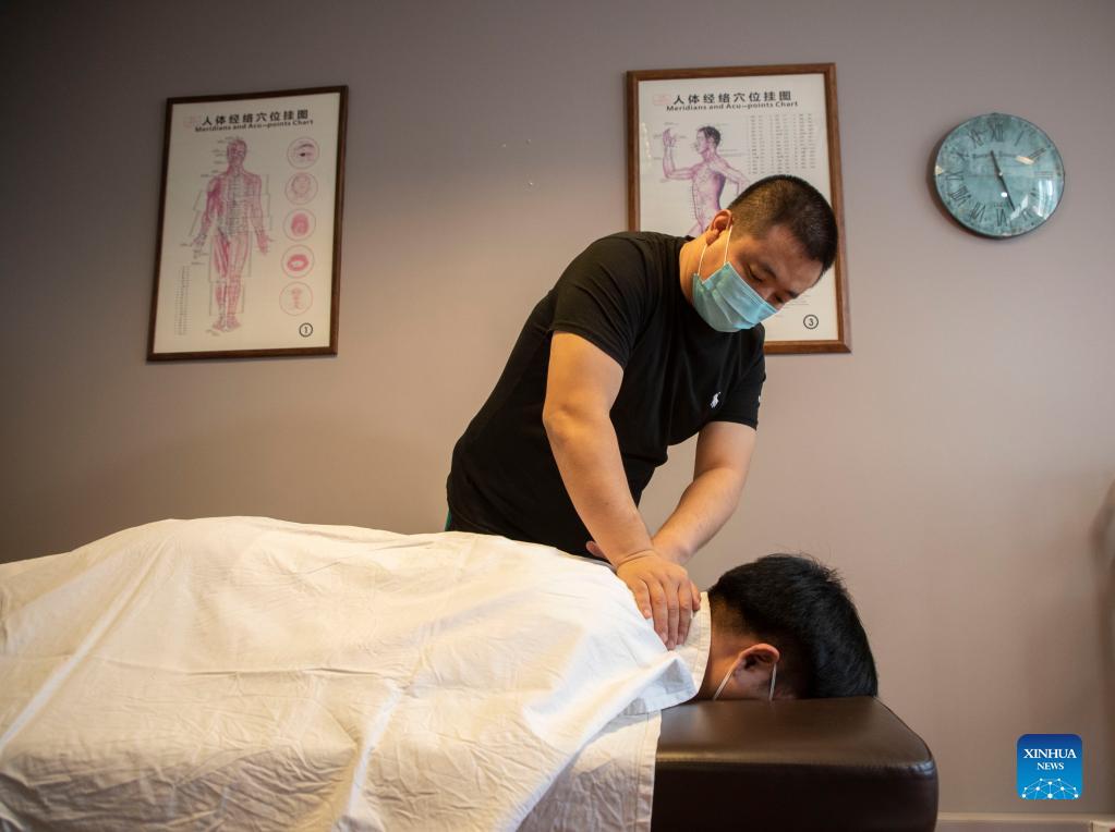 Yagang Luo, a Traditional Chinese Medicine (TCM) specialist, massages his patient at his clinic in Istanbul, Turkey, Oct. 5, 2021. (Photo by Osman Orsal/Xinhua)