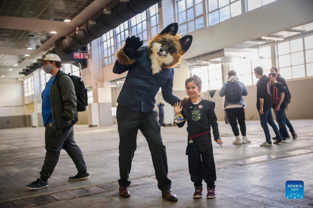 A girl poses for photo with a cosplayer at the Made in Asia animation and cartoon products fair in Brussels, Belgium, Oct. 8, 2021. (Xinhua/Zheng Huansong)